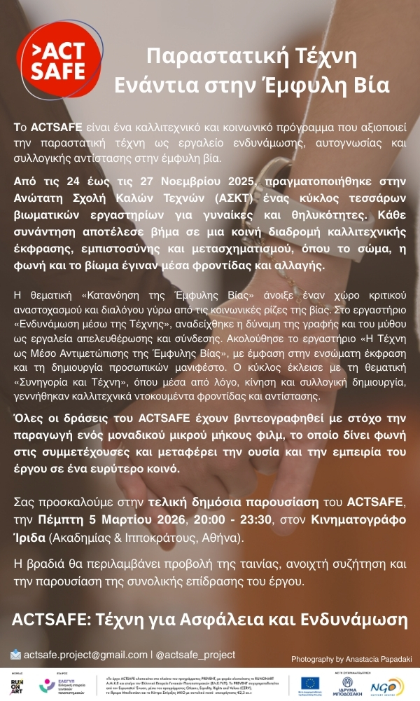 O κύκλος των βιωματικών εργαστηρίων του έργου ACTSAFE – Παραστατική Τέχνη Ενάντια στην Έμφυλη Βία ολοκληρώθηκε με μεγάλη επιτυχία τον Νοέμβριο του 2025 στην Ανωτάτη Σχολή Καλών Τεχνών.