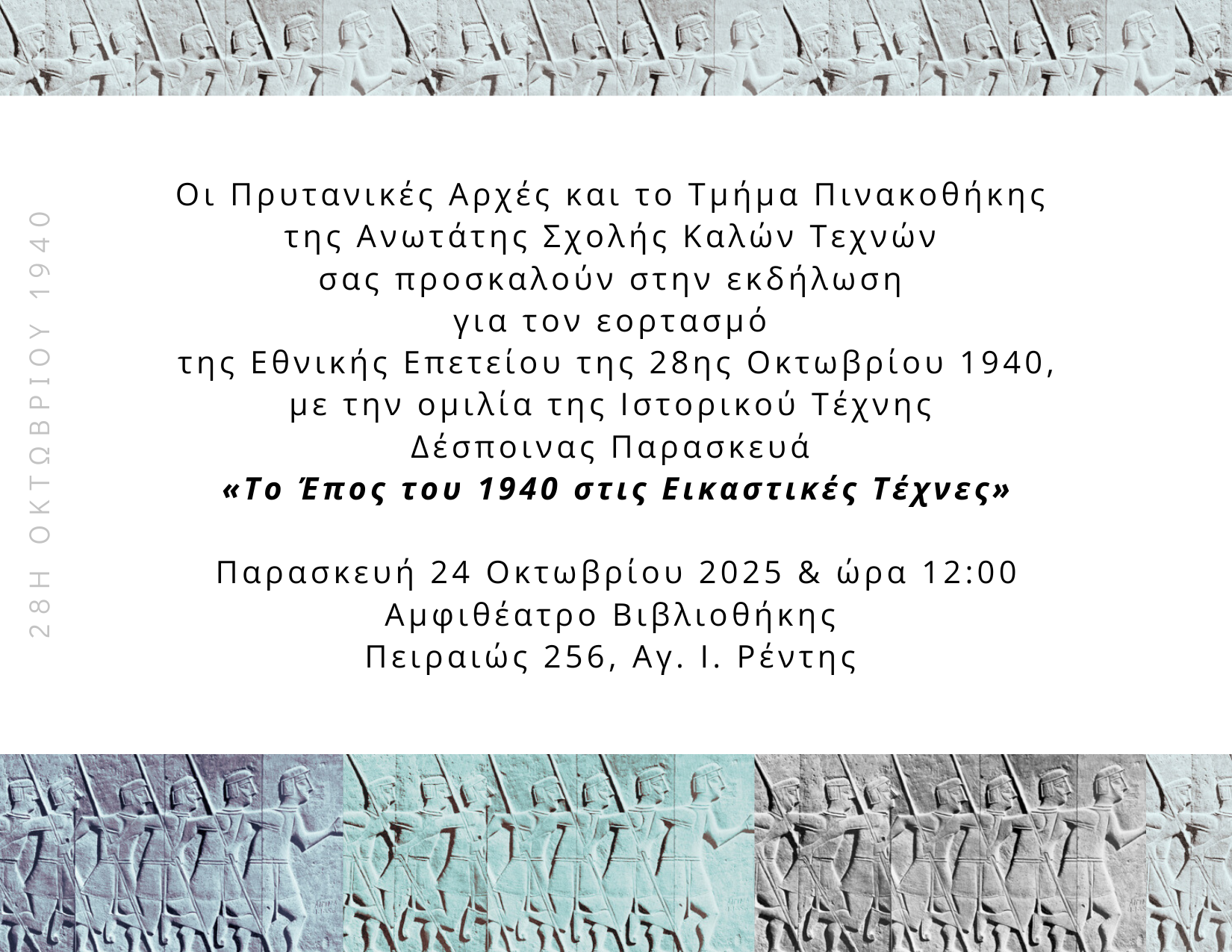 ΕΟΡΤΑΣΜΟΣ ΤΗΣ 28ΗΣ ΟΚΤΩΒΡΙΟΥ 1940 Η εκδήλωση για τον εορτασμό της εθνικής επετείου θα πραγματοποιηθεί την Παρασκευή 24 Οκτωβρίου 2025, στις 12:00 το μεσημέρι, στο Αμφιθέατρο της Βιβλιοθήκης.Ομιλήτρια θα είναι η φιλόλογος Δέσποινα Παρασκευά, υπάλληλος της Πινακοθήκης της ΑΣΚΤ, με θέμα «Το Έπος του 1940 στις Εικαστικές Τέχνες».