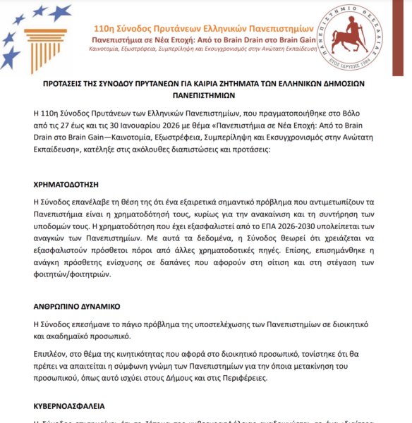 ΠΡΟΤΑΣΕΙΣ ΤΗΣ ΣΥΝΟΔΟΥ ΠΡΥΤΑΝΕΩΝ ΓΙΑ ΚΑΙΡΙΑ ΖΗΤΗΜΑΤΑ ΤΩΝ ΕΛΛΗΝΙΚΩΝ ΔΗΜΟΣΙΩΝ ΠΑΝΕΠΙΣΤΗΜΙΩΝ 01/02/202601/02/2026 Προτάσεις της 110ης Συνόδου ΠρυτάνεωνΛήψη