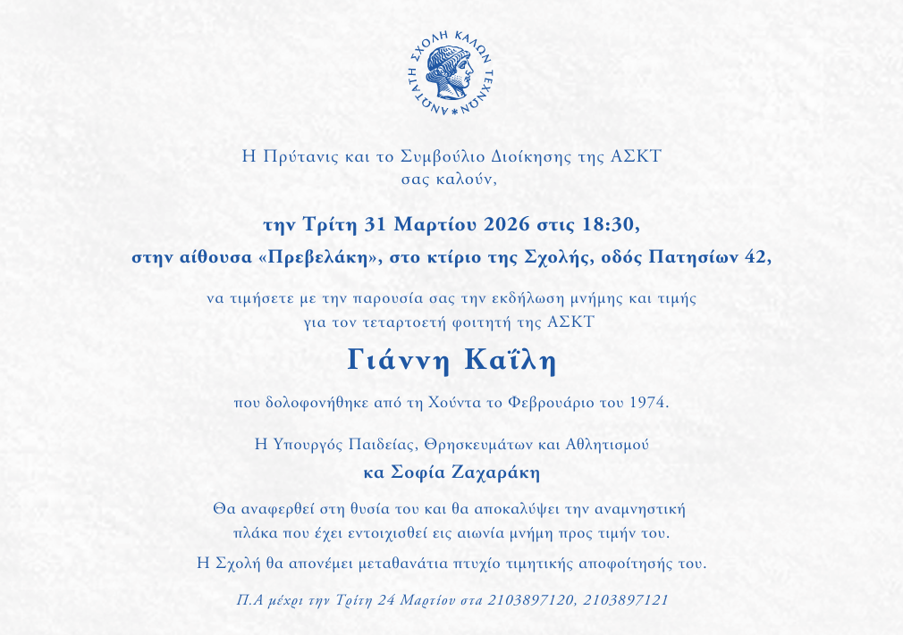 Η Πρύτανις και το Συμβούλιο Διοίκησης της Ανωτάτης Σχολής Καλών Τεχνών σας προσκαλούν στην εκδήλωση μνήμης και τιμής για τον τεταρτοετή φοιτητή της Σχολής, Γιάννη Καΐλη, ο οποίος δολοφονήθηκε από τη Χούντα τον Φεβρουάριο του 1974.