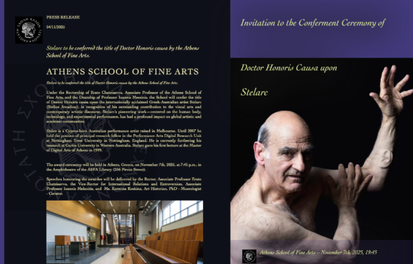 Stelarc to be conferred the title of Doctor Honoris causa by the Athens School of Fine Arts.