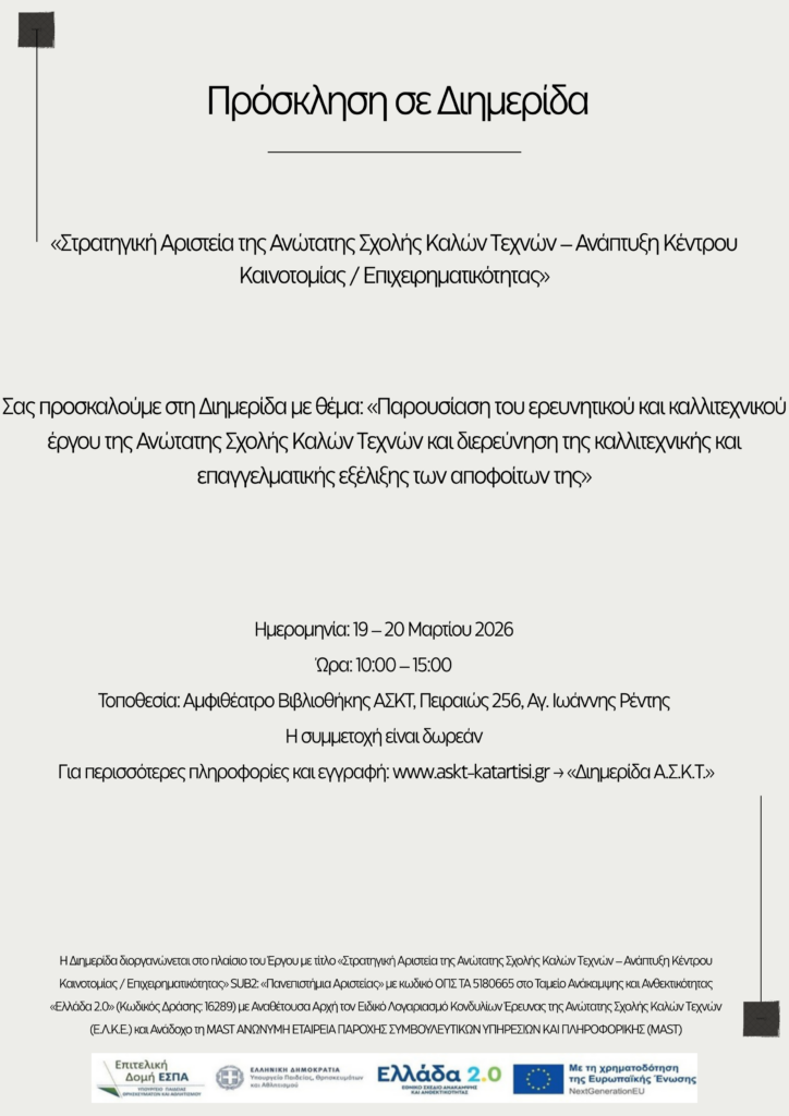 Στο πλαίσιο του έργου «Στρατηγική Αριστεία της Ανώτατης Σχολής Καλών Τεχνών – Ανάπτυξη Κέντρου Καινοτομίας / Επιχειρηματικότητας», διοργανώνεται διημερίδα στην ΑΣΚΤ με στόχο την ανάδειξη του ερευνητικού και καλλιτεχνικού έργου της σχολής, καθώς και τη συζήτηση γύρω από τις προοπτικές καλλιτεχνικής και επαγγελματικής εξέλιξης των αποφοίτων της.