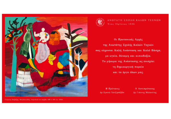 Ευχές για Καλό Πάσχα 07/04/202607/04/2026 Οι Πρυτανικές Αρχές της Ανωτάτης Σχολής Καλών Τεχνών σας στέλνουν θερμές ευχές για Καλό Πάσχα και Καλή Ανάσταση!